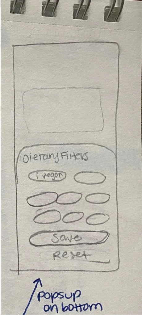 This wireframe shows seamless integration of dietary filters, allowing users to toggle options like “vegan” or “gluten-free” and view results dynamically. Intuitive tags and pop-ups enhance usability, helping users quickly find suitable options.