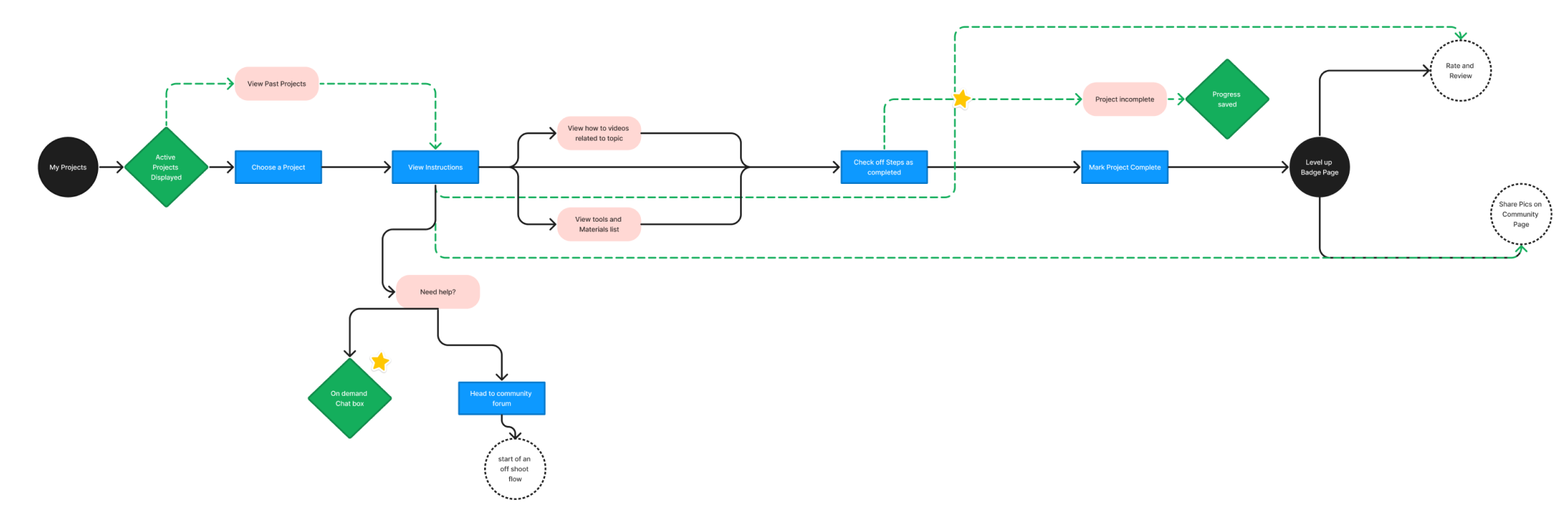 The "Current Projects" feature tackles barriers like lack of knowledge and experience by offering structured, step-by-step guidance. Visual aids, how-to videos, and easy access to material lists support users at every stage. With options to seek help through the community forum or mentor sessions, this design ensures users feel confident and empowered to complete their projects successfully.