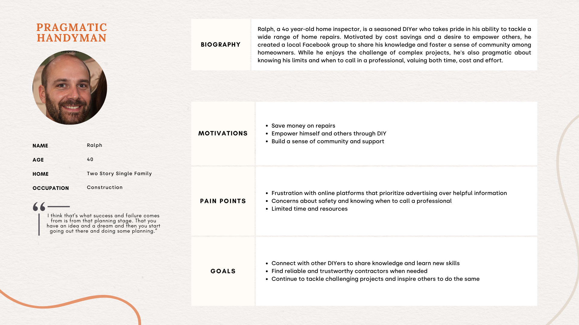 I want to know want to know how people learn DIY home repairs, their pain points, and their desired resources, so that we so that we can design a product that effectively supports their learning journey and empowers them to tackle repairs with confidence.