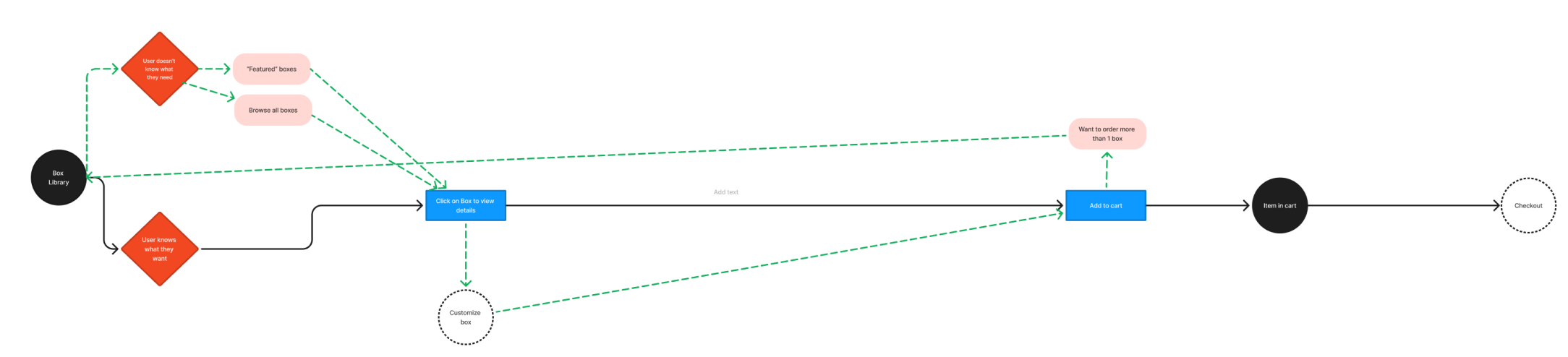 To address choice paralysis and provide a curated experience, the "Browsing and Choosing a DIY Box" flow streamlines project discovery. Users can filter and sort boxes based on interests and skill levels, with detailed descriptions and visuals guiding their decisions. This design ensures convenience and empowers users to find projects that inspire creativity and match their abilities.
